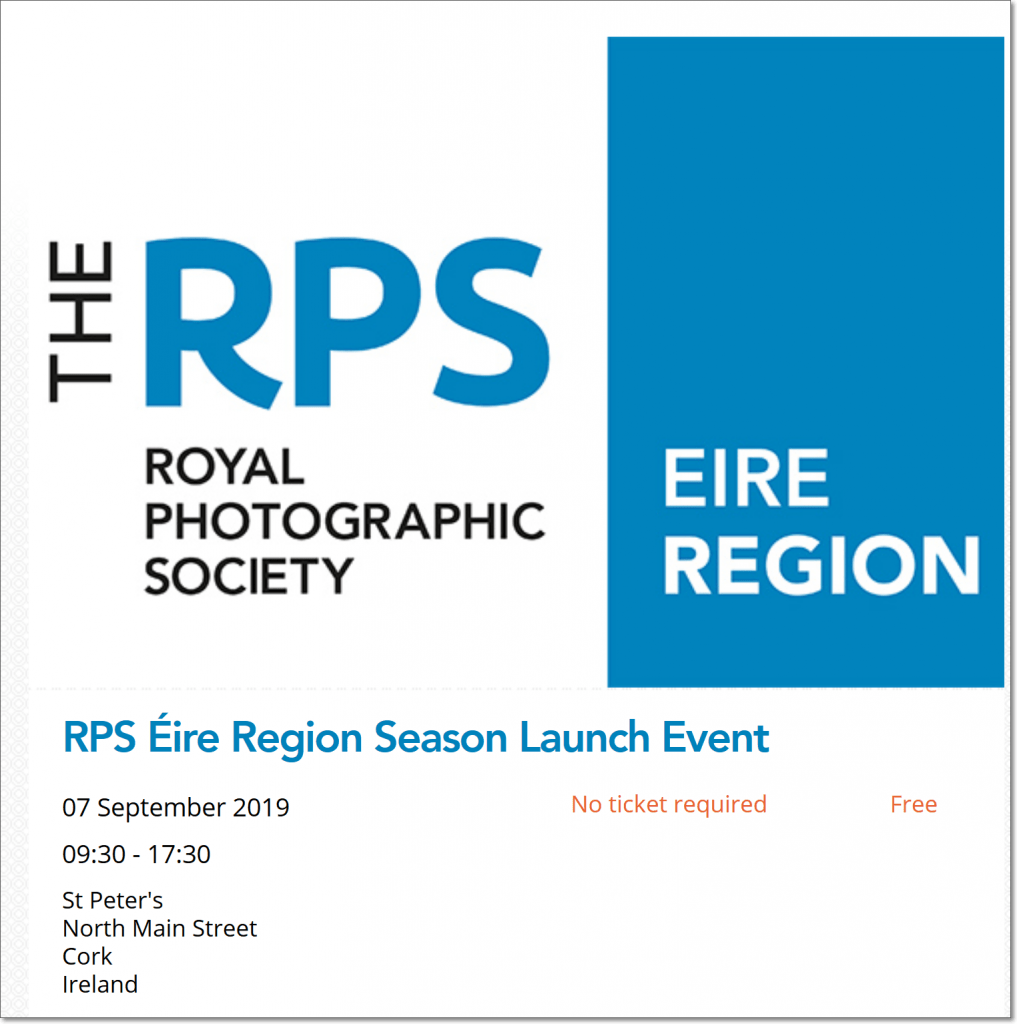 Royal Photographic Society Region Season Launch Event 07 September 2019, 09:30 – 17:30 St Peter’s, North Main Street, Cork This event is the first in a series. More events will take place throughout the country over the coming year or so, culminating in an AGM. Schedule: 9.30am – 12.30pm : A celebration of Distinctions hosted […]